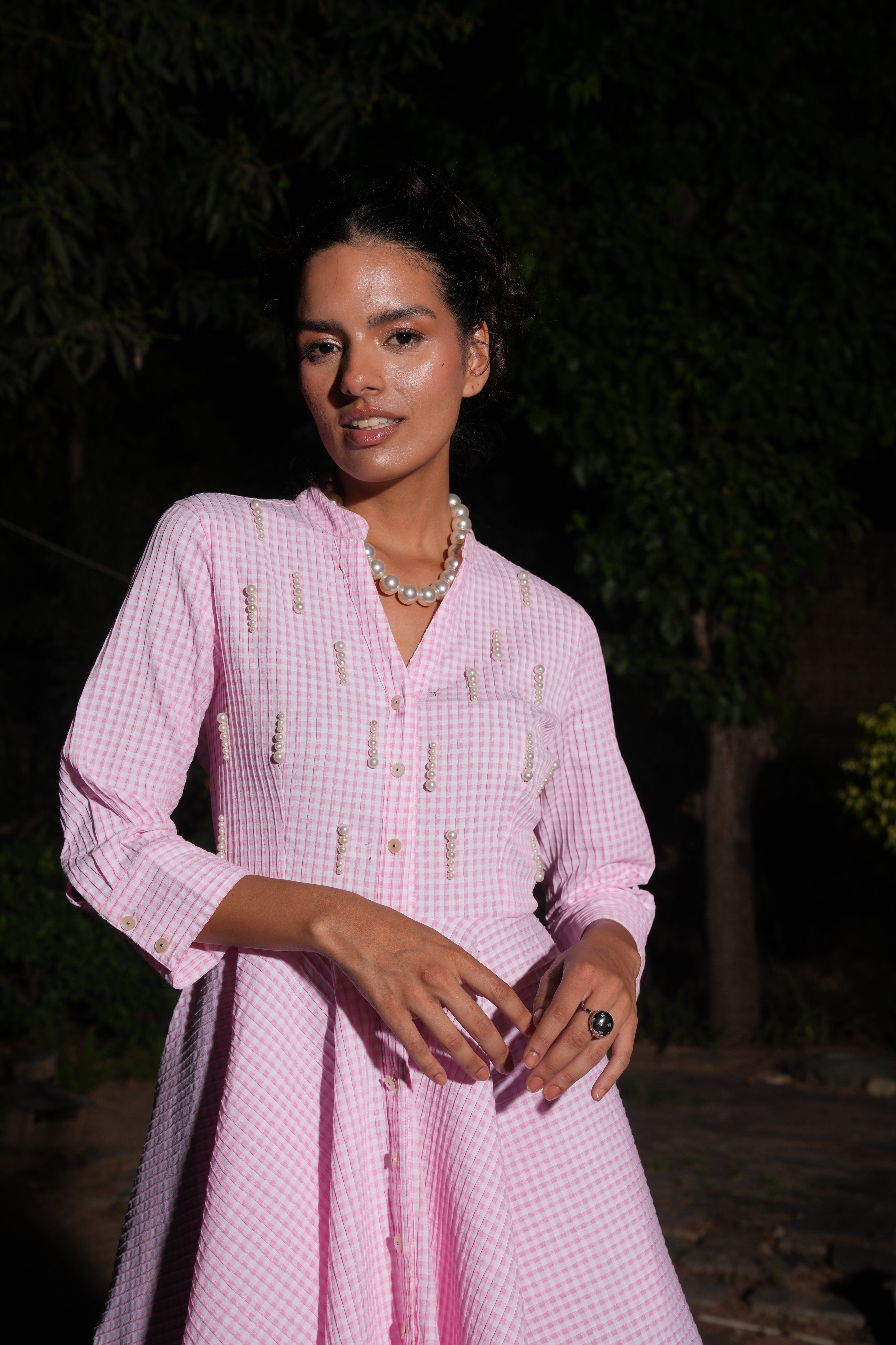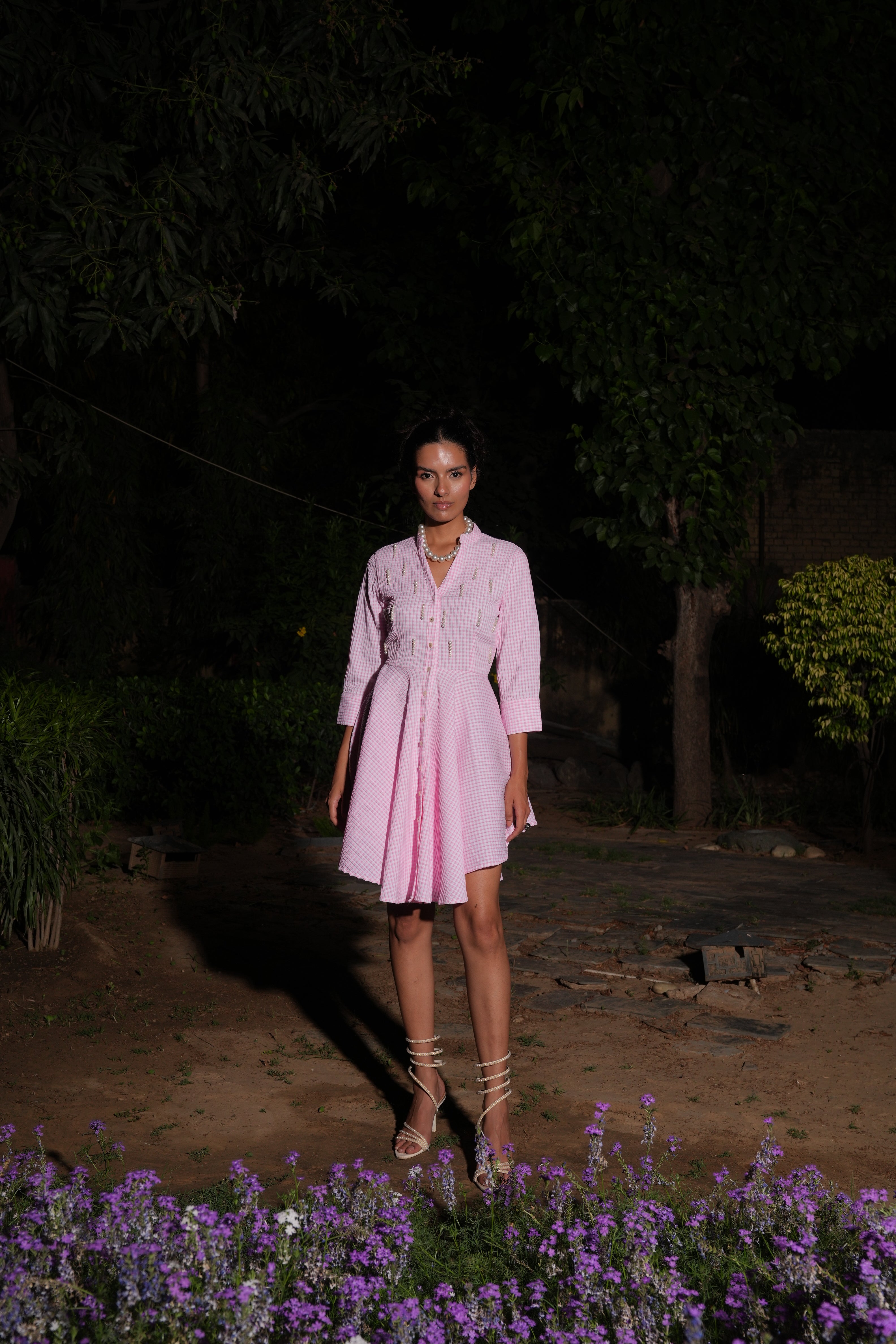 This intricate hand-embellished pintex premium cotton dress captivates with its delicate detailing, where subtle embellishments dance across the soft pink fabric, adding a touch of artisanal elegance. The tailored silhouette is expertly crafted to flatter every body type, with a fitted bodice that flows into a gently flared mini skirt, offering both comfort and grace. Featuring a classic shirt-style design with three-quarter sleeves and a buttoned front, this dress blends lightweight breathability with refined style, making it perfect for those seeking a versatile yet sophisticated look for any occasion.