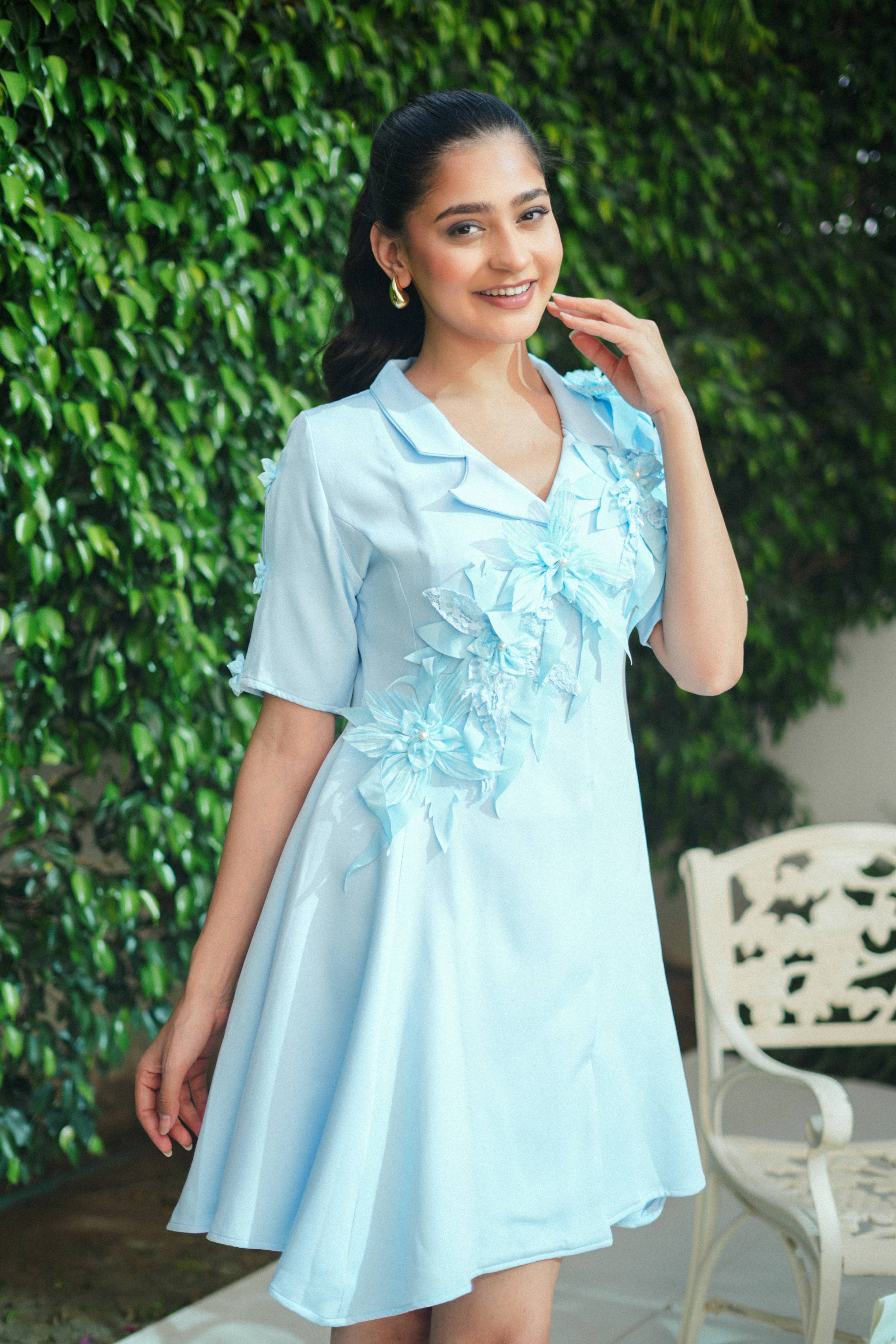 The Lapis Mini Dress is soft romance made effortless. Cut from lightweight baby-blue fabric, it features a refined notched lapel collar that opens into a gentle V, short sleeves, and a fitted bodice that releases into a flirty flared skirt. Hand-stitched 3D floral appliqués bloom across one shoulder and trail lightly down the front, adding texture and quiet artistry without overpowering the clean lines.