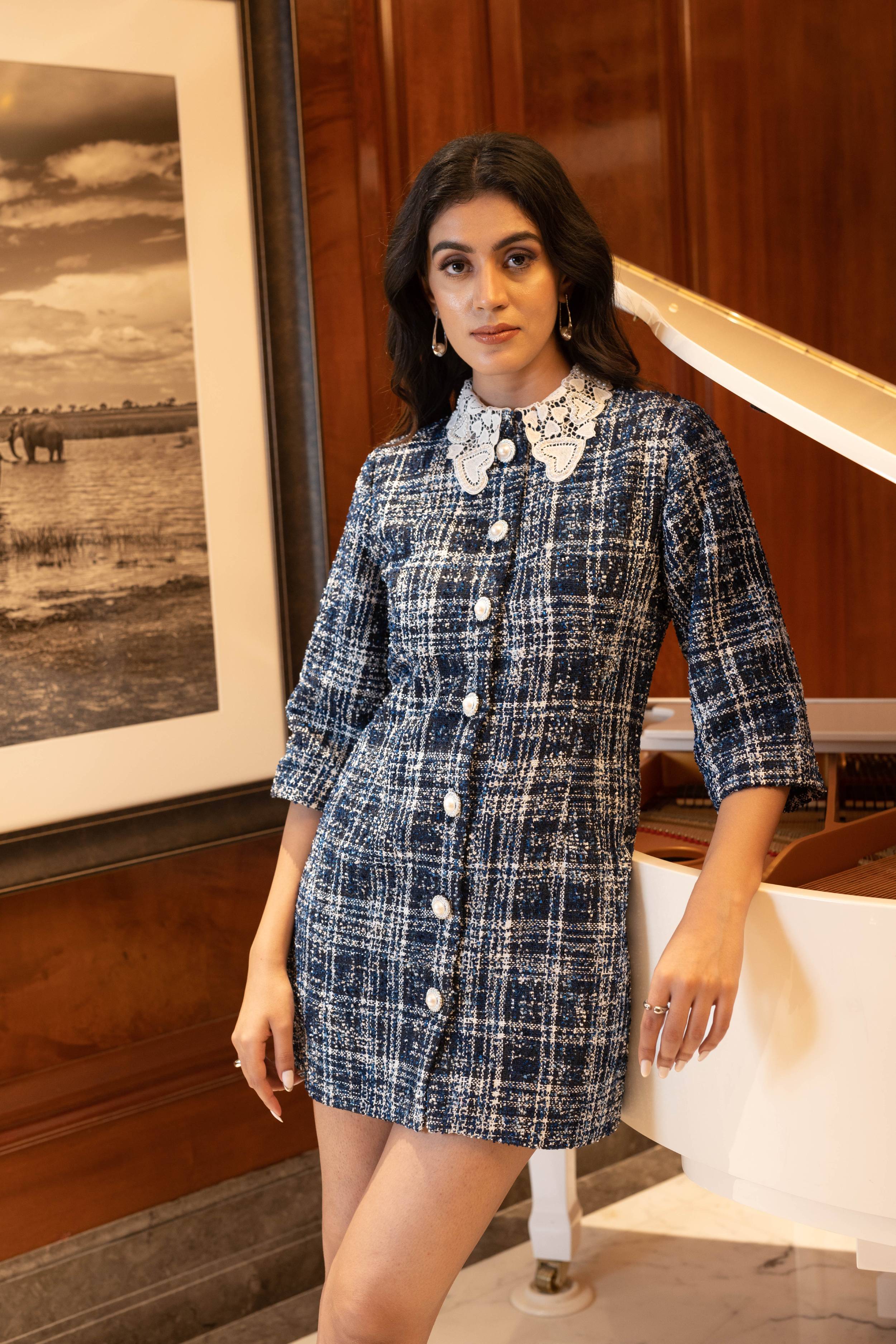 This chic blue tweed dress redefines elegance with a masterful fusion of classic charm and contemporary flair, making it a standout piece for every wardrobe: