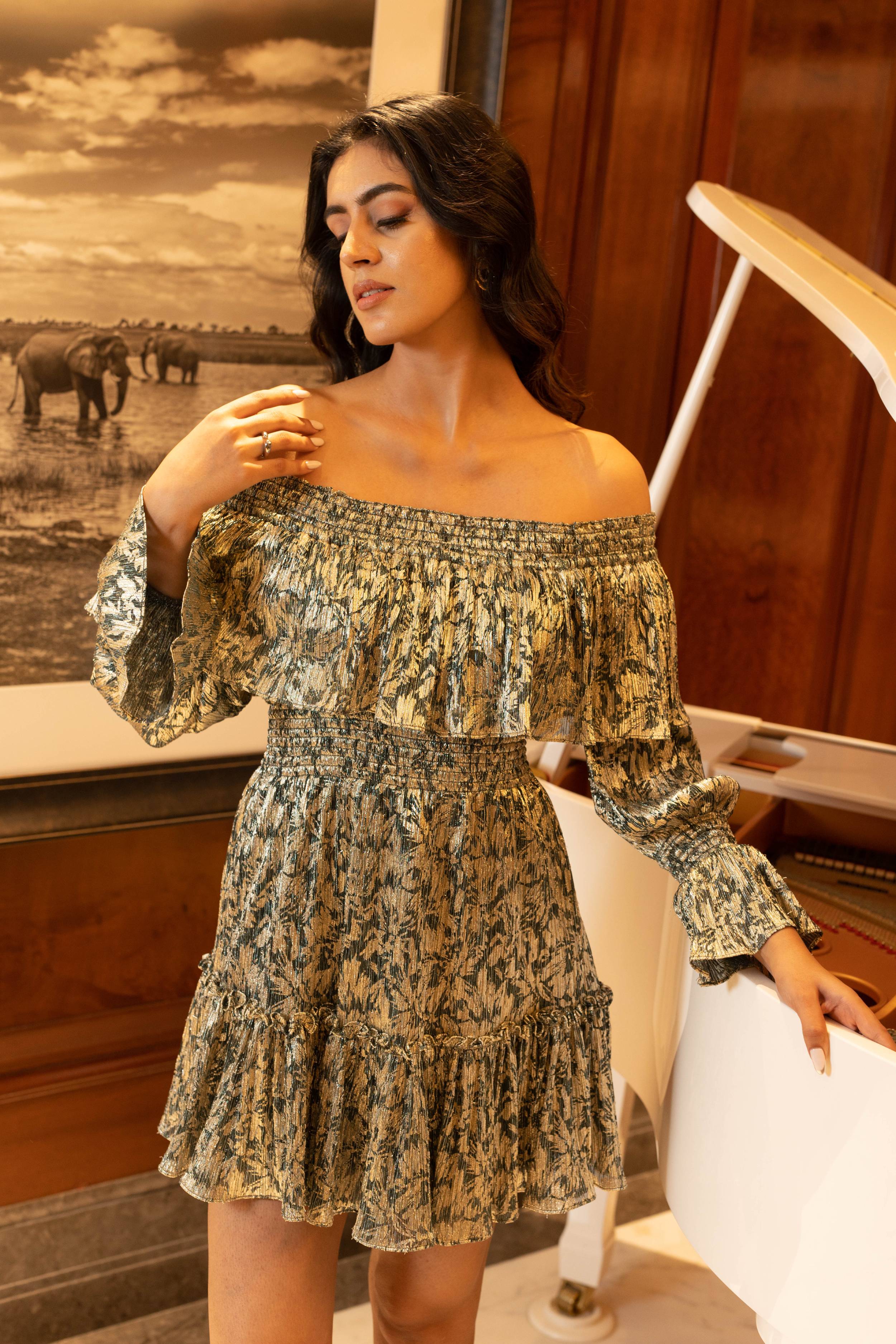 This after-party allure dress commands attention with its dramatic silhouette, crafted from a luxe fabric that shimmers with subtle elegance in a rich, earthy pattern. The off-shoulder neckline, adorned with delicate ruching, flows into voluminous long sleeves, creating a striking yet graceful frame, while the tiered mini skirt adds a playful bounce to every step. Perfect for an evening event, its tailored fit and luxurious texture blend sophistication with a hint of bold flair, making it an ideal choice for those ready to shine under the night’s spotlight.
