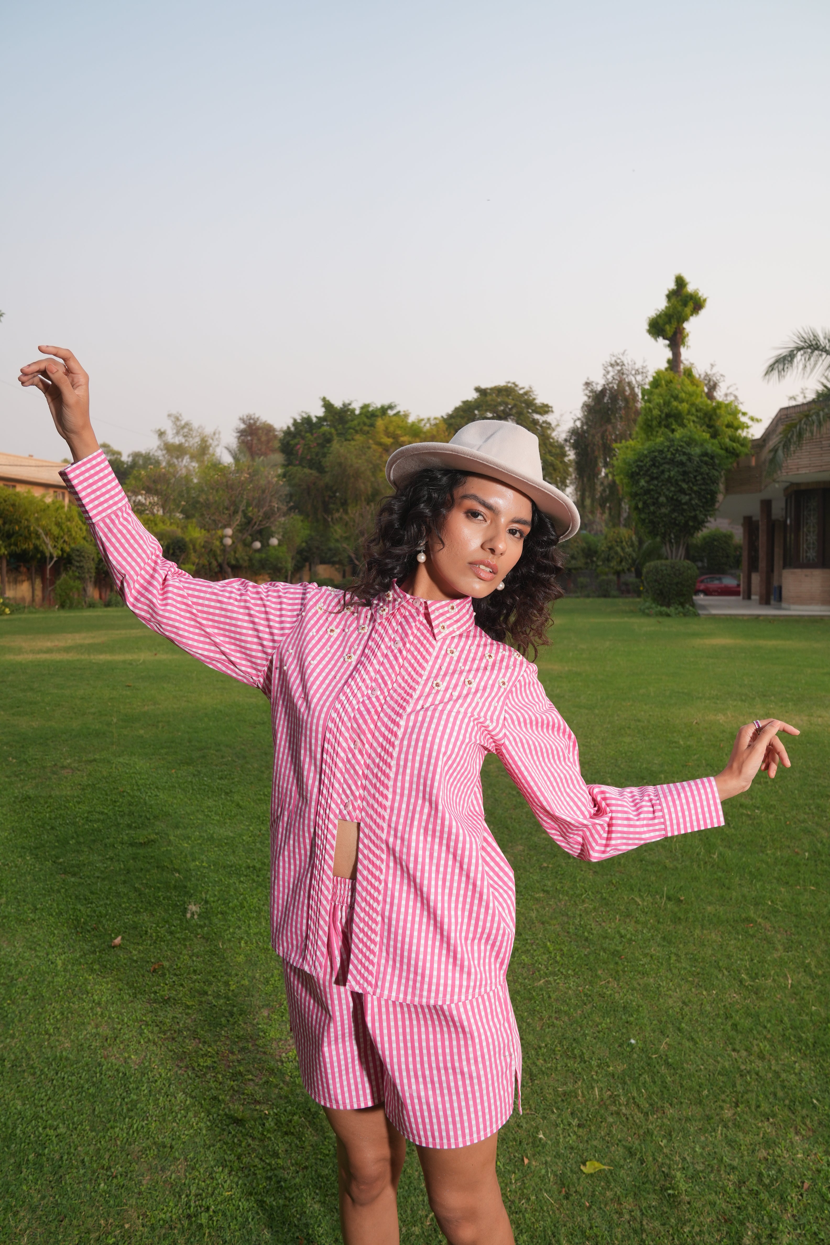This 100% cotton shirt and shorts co-ord set steals the spotlight with its vibrant pink hue and intricate tailoring details that craft a flattering, relaxed silhouette. Delicate pearl and crystal embroidery adorns the shirt, adding a touch of luxurious sparkle, while the matching shorts feature subtle stitching that enhances the ensemble’s head-turning appeal. The long sleeves and button-down front of the shirt pair seamlessly with the tailored shorts, blending comfort with chic sophistication. Perfect for those seeking a standout look, this set combines premium craftsmanship with playful elegance for any occasion.